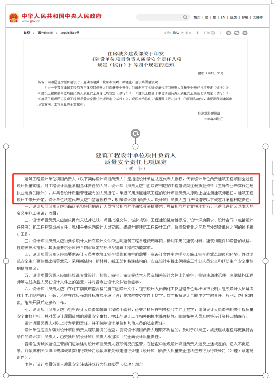 说明:根据住房城乡建设部2015年3月6日通知《住房城乡建设部关于印发<建设单位项目负责人质量安全责任八项规定(试行)>等四个规定的通知》(建市〔2015〕35号)中的《建筑工程设计单位项目负责人质量安全责任七项规定(试行)》的相关规定: