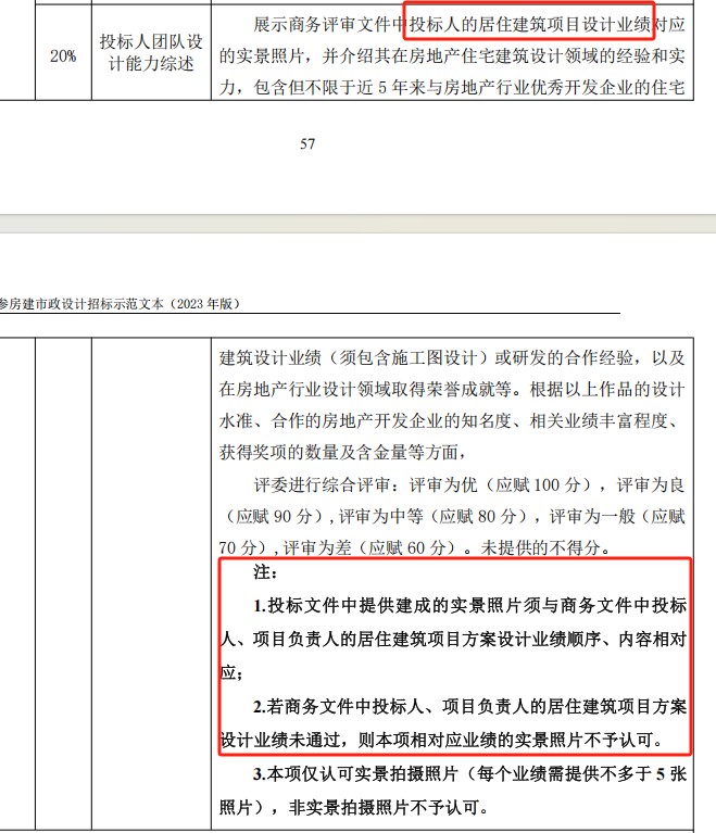 2.若商务文件中投标人、项目负责人的居住建筑项目方案设计业绩未通过,则本项相对应业绩的实景照片不予认可。”