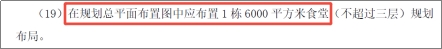 12.《招标文件第五章第二-(一)-1-(19)条》,“在规划总平面布置图中应布置1栋6000平方米食堂(不超过三层)规划布局。”