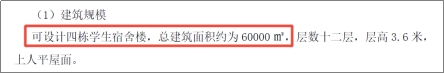 9.《招标文件第五章第二-(一)-1-(1)条》:“可设计四栋学生宿舍楼,总建筑面积约为60000平方米,层数十二层,层高3.6米,上人平屋面。”