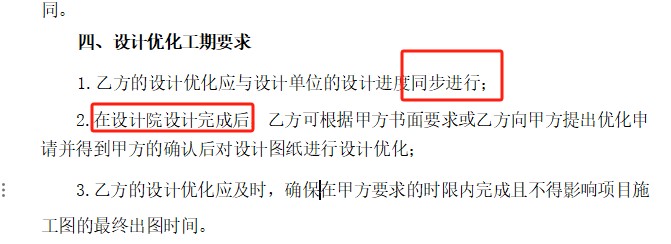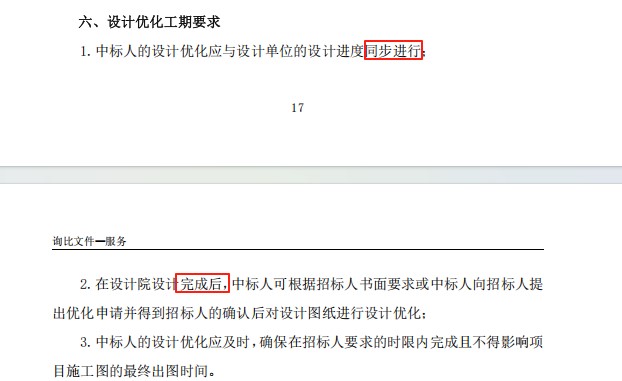 1.第三章招标人要求处,第六、设计优化工期要求1、2点有歧义,按前文属于结果优化,需要设计完成施工图后进行,建议删除第1条,第五章合同内也相应删除。