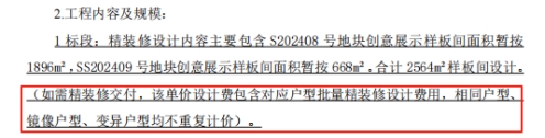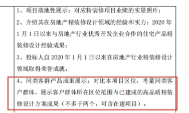 精装修专业施工图设计负责人、施工图给排水专业负责人、施工图暖通专业负责人、施工图电气专业负责人任职资格里,需满足住宅精装样板间(房)或营销展示中心(或住宅配套会所或售楼部或售楼中心或销售中心或售楼处)设计业绩,单个合同中室内装饰(或室内精装修)设计内容的每平方米设计费用不少于2000元(不含软装设计费用)。在业绩中担任精装修专业施工图设计负责人或具有室内设计相关专业中级及以上职称(标后提供)。