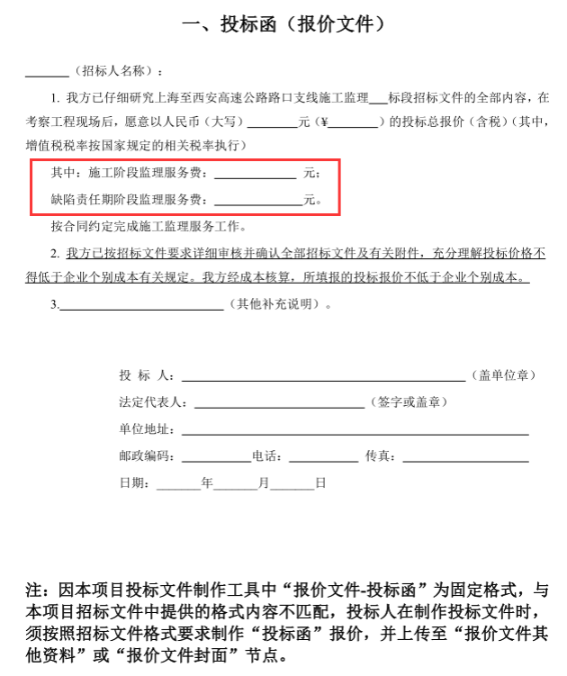 注:因本项目投标文件制作工具中“报价文件-投标函”为固定格式,与本项目招标文件中提供的格式内容不匹配,投标人在制作投标文件时,须按照招标文件格式要求制作“投标函”报价,并上传至“报价文件其他资料”或“报价文件封面”节点。