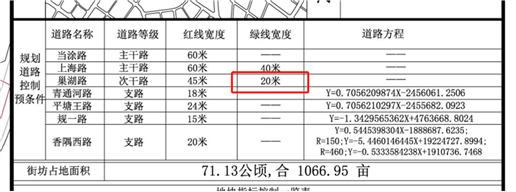 控规是图表并用的,控规道路控制预条件表的绿线宽度20米指的是道路两侧绿线共20米;控规图上明确标识了一侧绿线宽带10米。