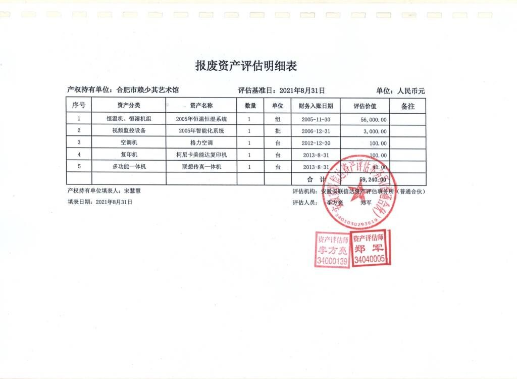 | 1.转让标的包括恒温恒湿系统(含空调多联机)、智能化系统、格力立柜空调、复柯尼卡美能达复印机、联想传真一体机,详见附件图一:报废资产评估明细表。 2.本次转让标的为一次性整体打包转让。委托方不对标的数量、重量做任何承诺,标的按现状移交,移交时不称重、不清点。标的目前存放于合肥市赖少其艺术馆、市政务文化新区艺术公园内。意向受让方须认真踏勘现场以充分了解标的现状,如有疑问,主动向委托方咨询。 上述资产转让已经上级主管单位批准同意处置,安徽安联信达资产评估事务所(普通合伙)出具了皖安联信达评字[2021]053号《评估报告书》,资产评估总价值为人民币59240元,资产评估结果已经有权部门备案。 |