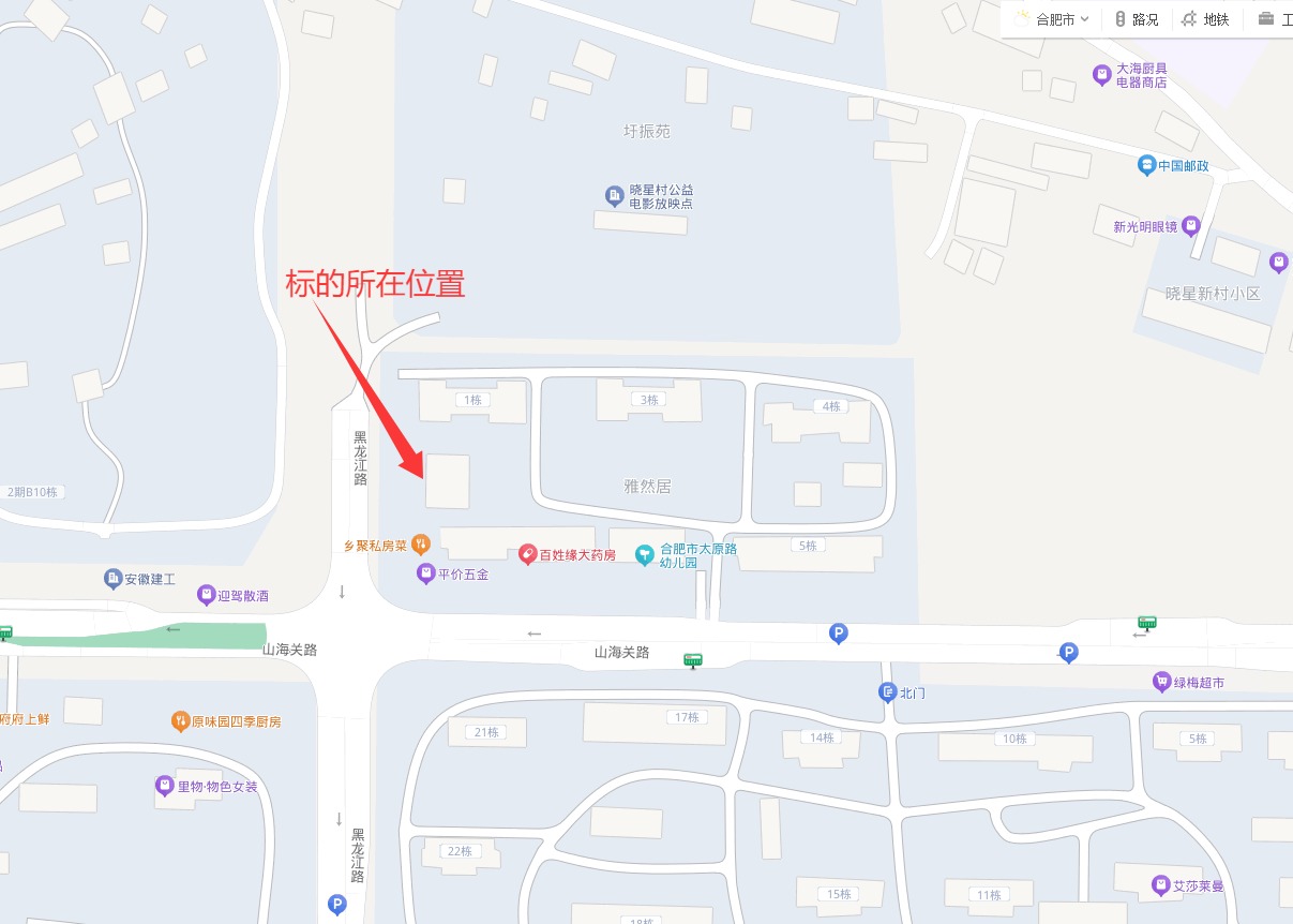 | 1.雅然居103#楼公租房商业用房位于合肥市包河区山海关路202号雅然居2幢。经营房产为框架结构,层位为第1-2层,建筑面积约722.6㎡,面积仅供参考,以实际移交面积为准,实际移交面积存在差异的,不调整成交价格。具体区域范围由意向方自行向委托方咨询了解确认。